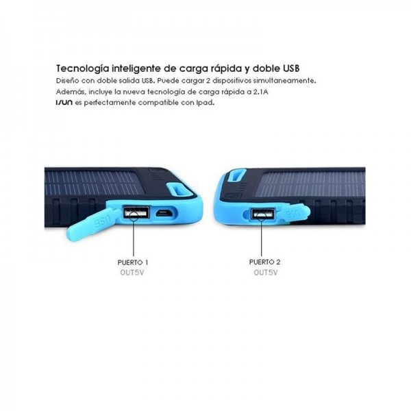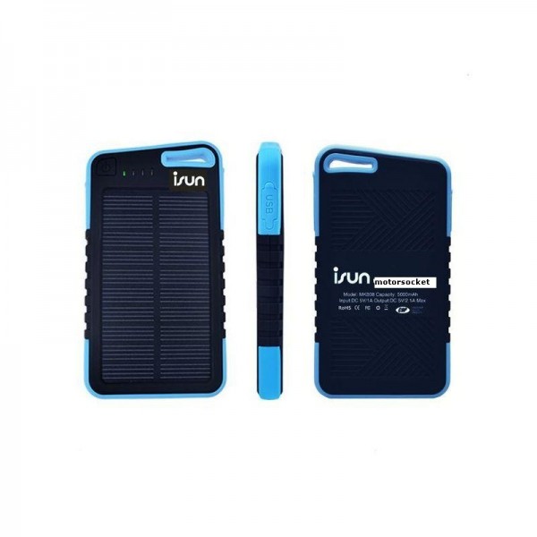Le chargeur solaire portable iSun (5000 mAh batterie d'alimentation) a une grande capacité de stockage atteignant 5000mAh. Avec un design compact et résistant aux chocs, il sera le partenaire idéal pour réaliser des excursions les plus audacieux, d'aventures et de voyages, toujours fournir de l'énergie à tous nos téléphones portables, tablets,Gps, ordinateurs et dispositifs digitales en utilisant la lumière du jour solaire. La technologie militaire développée a fait une batteries de polymère avec un revêtement de protection en silicone spécialement conçu pour les activités a l’exterieur. Il sera votre bouée de sauvetage pour les loisirs ou pour les urgences.