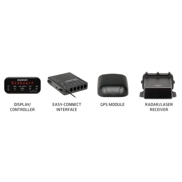 PASSPORT 8500ci Inoltre ES include: un manuale completo delle attrezzature, guida all'installazione, visualizzazione dello schermo / di controllo, ricevitore radar frontale e modulo di interfaccia laser 12v. con l'altoparlante amplificato, antenna GPS, bicolor, cavo di collegamento al PC e tutta la bulloneria.