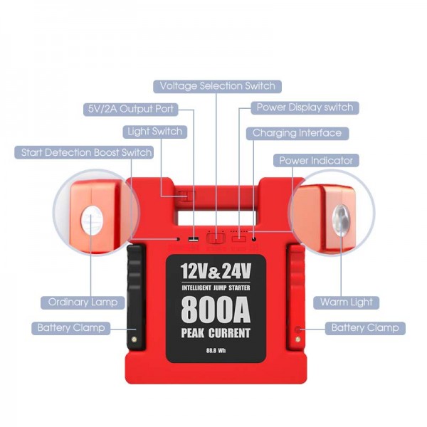 Con la batteria di avviamento di emergenza JP27A Heavy Duty da 24000 mAh puoi avviare qualsiasi veicolo in modo facile e semplice se la batteria si scarica. Grazie alla sua corrente di spunto di 400A con un picco di oltre 800A, e alle uscite a 12V e 24V, permette di avviare tutti i tipi di veicoli.Dispone inoltre di luci di emergenza a LED e di un sistema di protezione sul selettore di tensione.